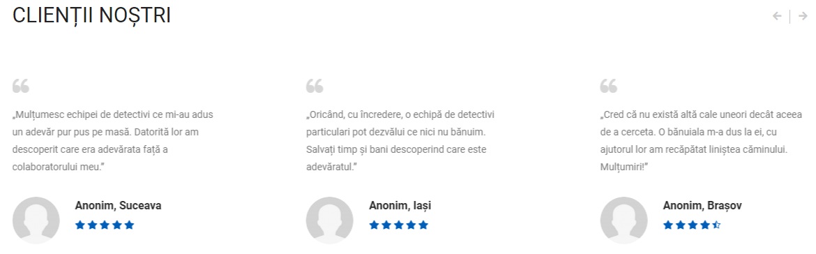 Mai jos ai un exemplu de recenzii de pe site-ul detectivpremium.ro care poți fii convins că vin direct de la clienți pentru că, după cum vezi, nu sunt chiar perfecte.